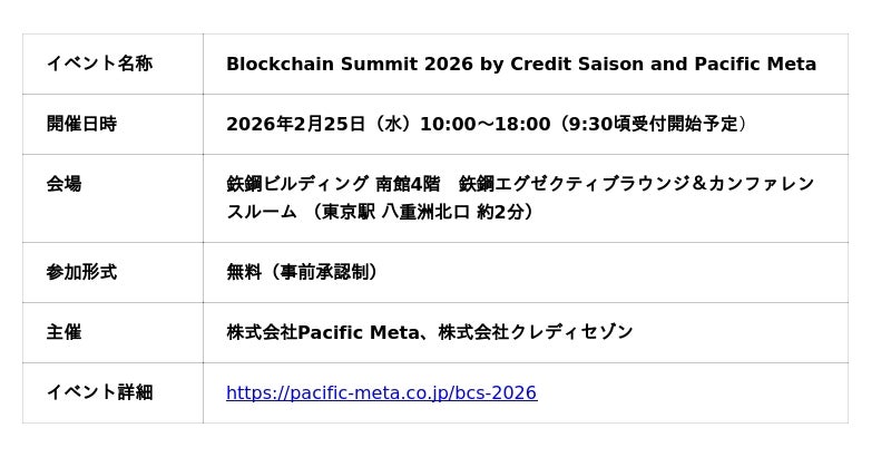株式会社 Pacific Meta(本社:東京都港区、代表取締役:岩崎 翔太、以下「Pacific Meta」)と株式会社クレディセゾン(本社:東京都豊島区、代表取締役(兼)社長執行役員 COO:水野 克己、以下「クレディセゾン」)は、2026年2月25日(水)に開催するブロックチェーンに関する国際カンファレンス「Blockchain Summit 2026 by Credit Saison and Pacific Meta」(以下「本イベント」)において、第一弾となる登壇者・セッション情報を発表いたします。