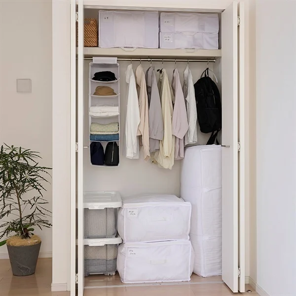 外側がポリエステル生地で汚れをさっと拭けるお手入れ簡単な布製収納です。クローゼット内のデッドスペースを有効活用できます。