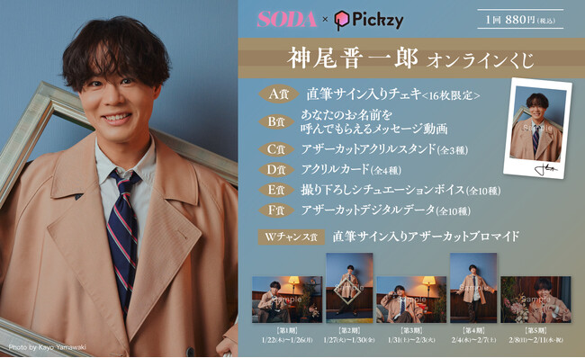 2026年1月22日(木)に、ぴあのオンラインくじサービス「Pickzy(ピクジー)」(https://pickzy.pia.jp/)にて、「SODA×Pickzy 神尾晋一郎 オンラインくじ」の販売を開始いたしました。