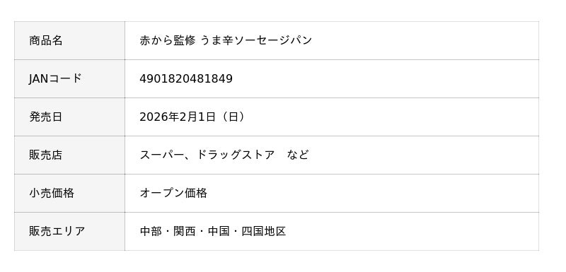 敷島製パン株式会社(Pasco)は「赤から監修 うま辛ソーセージパン」を、2026年2月1日(日)より中部・関西・中国・四国地区にて1カ月限定で発売します。