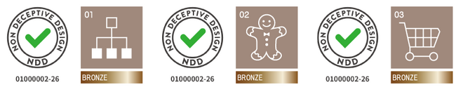 取得したNDD認定のマーク。組織的対策(左)、クッキーバナー(中央)、 購入前最終画面(右)にそれぞれ表示される