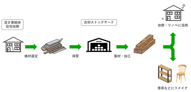 空き家解体等で発生した廃材から活用できるものを古材として保管し、古材ストックヤードにて製材・加工し、空き家改修やリノベーションに活用、家具などにリメイクすることで、古材の活用をはかります。[画像1: https://prcdn.freetls.fastly.net/release_image/78202/213/78202-213-17961169849fded806206cf2c9f3210b-1588x765.png?width=536&quality=85%2C75&format=jpeg&auto=webp&fit=bounds&bg-color=fff ]