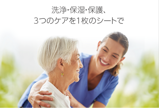 患者とスタッフの笑顔のために。水を使わない清拭だから、衛生的かつ負担軽減が可能なシートです。