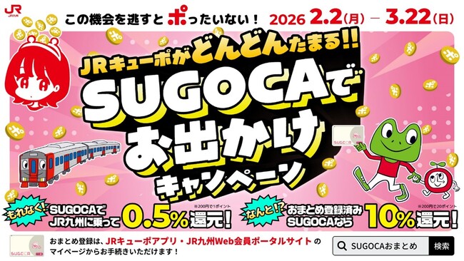 JR九州は、2026年2月2日から2026年3月22日までの期間、交通系ICカードSUGOCAでのJR九州線のご利用に応じてJRキューポがたまる「SUGOCAでお出かけキャンペーン」を実施します。