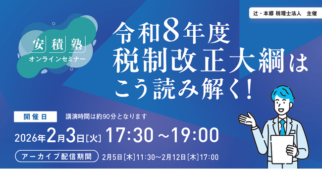 辻・本郷 税理士法人(本社:東京都新宿区、理事長:桑木小恵子)は、2026年2月3日(火)にオンラインセミナー「【安積塾】令和8年度税制改正大綱はこう読み解く!」を開催いたします。