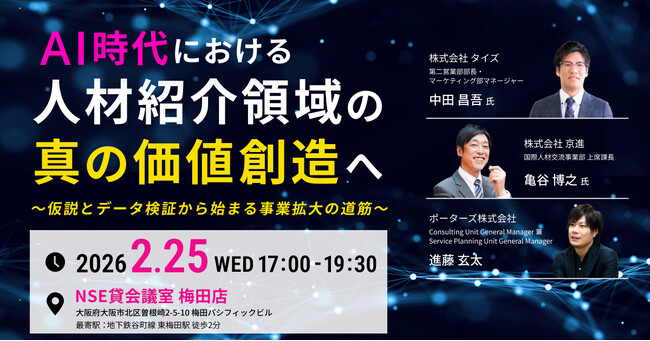 人材ビジネス向けマッチングシステムを提供するポーターズ株式会社(東京証券取引所グロース.証券コード5126、東京都港区、代表 西森 康二)は、「AI時代における人材紹介領域の真の価値創造へ ~仮説とデータ検証から始まる事業拡大の道筋~ 」と題した無料オフラインイベントを2026年2月25日(水)17:00~大阪で開催します。