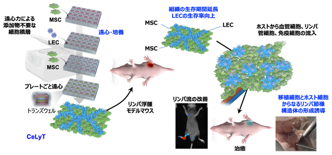本研究では、遠心力を利用した細胞積層技術によって作製された、リンパ管網を有する細胞構造体(Centrifuge-based bioengineered Lymphatic Tissue:CeLyT)が、リンパ浮腫モデルマウスにおける浮腫を効果的に治療できることを示しました。