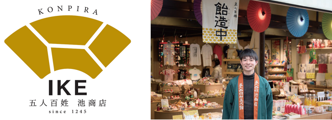 1245年(寛元3年)、香川県琴平町の金刀比羅宮の境内(参道)にて創業した「五人百姓池商店」(以下 同社)は、「こんぴらさん」の名で親しまれるこの地で、780年以上にわたり伝統のご利益飴「加美代飴(かみよあめ)」の製造・販売を続けています。五人百姓とは、1,000年超の歴史をもつといわれる金刀比羅宮が琴平町に来る際、お供してきた5つの家系のことであり、神事の手伝いを続けながら、今も参拝者向けに飴を作り続けている5軒の飴屋を指します。その家系のひとつが同社です。