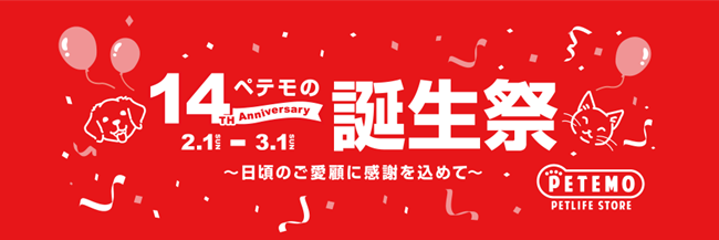 イオンペット株式会社(代表取締役社長:米津一郎、以下イオンペット)は、2026年2月21日(土)に迎える設立14周年を記念として、イオンペットが運営する店舗、動物病院、ECサイト、ならびに ペテモの公式アプリにて、2月の期間中に「ペテモの誕生祭」を開催します。