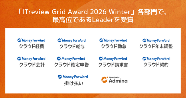 マネーフォワードグループが提供する10プロダクトが、アイティクラウド株式会社主催「ITreview Grid Award 2026 Winter」の各部門にて、最高位である「Leader」を受賞しました。今回受賞したプロダクトは、株式会社マネーフォワードのバックオフィスSaaS『マネーフォワード クラウド』の8プロダクト、マネーフォワードケッサイ株式会社の企業間後払い決済・請求代行サービス『マネーフォワード 掛け払い』、マネーフォワードi株式会社の情シス向け業務OS『マネーフォワード Admina』です。