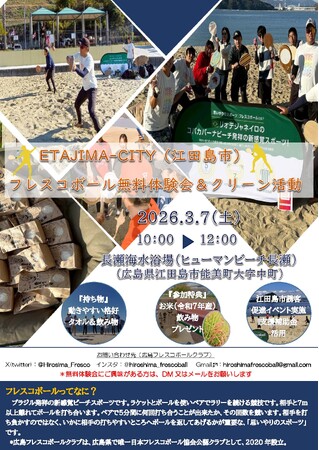 コミュニケーションデザインスポーツ"フレスコボール"の国内での普及活動を行っている一般社団法人日本フレスコボール協会(以下、JFBA、代表理事 窪島剣璽)は、公認地域クラブ『広島フレスコボールクラブ』が3月7日(土)午前に「ETAJIMA - CITY フレスコボール無料体験会&クリーン活動」を開催することを発表いたします。