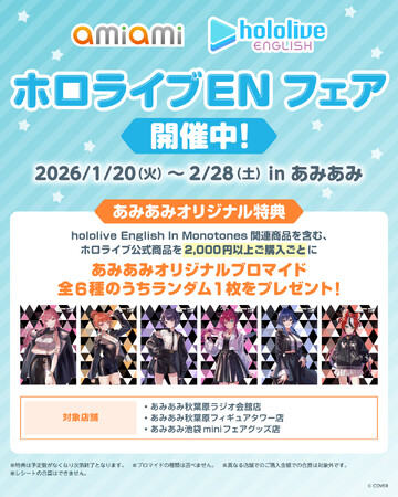 2.「あみあみ秋葉原ラジオ会館店」「あみあみ池袋miniフェアグッズ店」「あみあみ秋葉原フィギュアタワー店」にて、『ホロライブENフェア』を、2026年1月20日(火)~2月28日(土)まで開催。