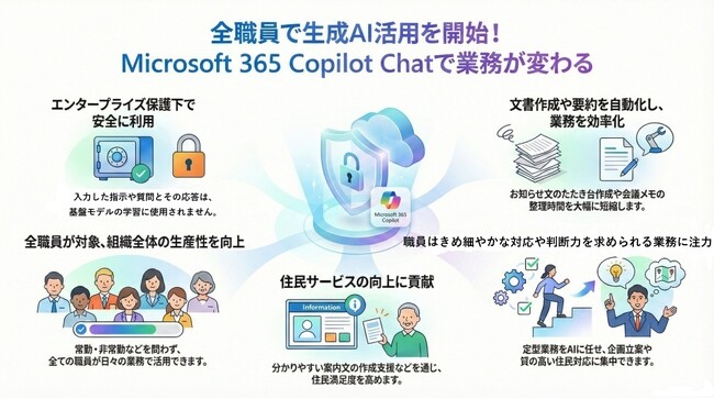 本取り組みは、2027年12月に予定している新基幹システム稼働を見据えた「日常のDX基盤」整備の一環として実施するものであり、生成AIを活用することで、職員が、住民対応や企画・調整など、きめ細やかな対応や高い判断力を要する業務に専念できる環境づくりを進めていきます。