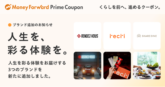 マネーフォワードホーム株式会社は、お金の見える化サービス『マネーフォワード ME』プレミアム会員限定「Prime Coupon(プライムクーポン)」において、本日2026年1月23日(金)より新たなクーポンを提供開始します。「人生を、彩る体験を。」をテーマに、自動車の共同所有サービス「RENDEZ-VOUS(ランデヴー)」、チケットのサブスクリプションサービス「recri(レクリ)」、出張シェフサービス「SHARE DINE(シェアダイン)」を新たな提携ブランドとして迎えました。