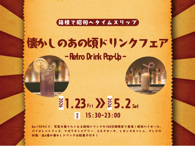 家族みんなで楽しめる温泉・自然・食事が揃い、赤ちゃんや小さなお子さま連れでも安心して滞在できる箱根ホテル小涌園(所在地:神奈川県足柄下郡箱根町二ノ平1297、支配人:阪本清嗣)では、昭和の懐かしさを テーマにした期間限定ドリンクフェア「昭和100年特別企画 期間限定!懐かしのあの頃ドリンクフェア」を2026年1月23日(金)より5月2日(土)まで開催いたします。