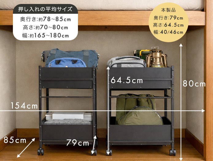 一般的な押し入れの平均サイズは、奥行:約78~85cm/高さ:約70~80cm/幅:約165~180cmです。本製品では、奥行:約79cm/高さ:約64.5cm/幅:約40または46cmとなっており、一般的な押し入れのサイズに合わせて設計してあるので、デッドスペースを最大限活用してたっぷり収納が可能です。