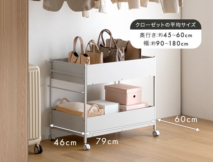 また、一般的なクローゼットの平均サイズは、奥行:約45~60cm/幅:約90~180cmとなっているため、キャスター付き収納ワゴンを横向きにするとクローゼットでも使用できます。