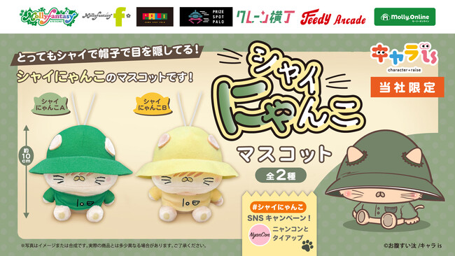 人間と目を合わすことができず帽子で目を隠しているとってもシャイな猫の「シャイにゃんこ」がぬいぐるみマスコットになって、当社限定でプライズ化!緑色と黄色の2種を展開いたします。