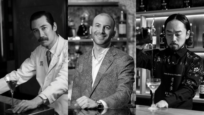 左より「Bar TRENCH 」ロジェリオ 五十嵐 ヴァズ氏/「ブルガリ バー」アンドレア・ミナレッリ/京都ドライジン「季の美」佐久間“マーシー”雅志氏