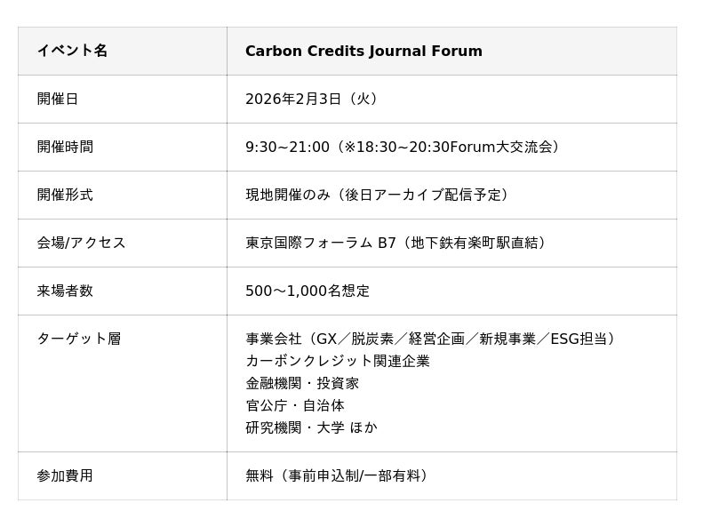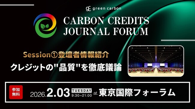 ネイチャーベースのカーボンクレジット創出・販売事業を展開するGreen Carbon株式会社(代表取締役:大北潤、以下Green Carbon(グリーンカーボン))は、国内最大級のカーボンクレジット特化フォーラム「Carbon Credits Journal Forum(以下、本Forum)」を、2026年2月3日(火)に東京国際フォーラムB7ホール(有楽町駅直結)にて開催します。国内外の脱炭素主要プレイヤー500名以上が一堂に会し、カーボンクレジットの未来を本気で語り合う場を提供します。
