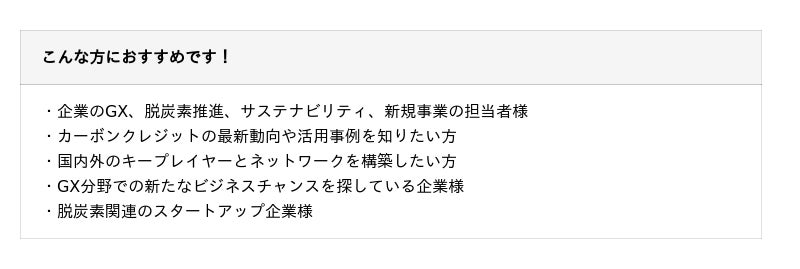 - 【GX/脱炭素/ESG/新規事業担当者必見!】国内最大規模のカーボンクレジットイベント「Carbon Credits Journal Forum」Session4.「GXスタートアップ」の登壇者決定!01/19 16:11