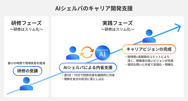研修×AIのシェルパス、最小限の研修時間と職場での内省を組み合わせた独自のキャリア支援プログラムをリリース。週1回15分のAI対話で実体的なキャリア開発を強力に推進。
