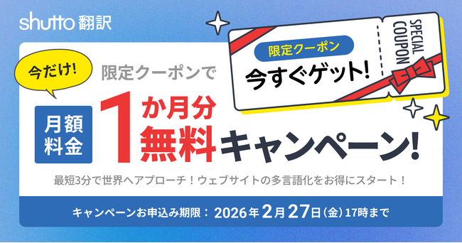 最短3分で多言語化を実現するウェブサイト翻訳ツール『shutto翻訳』が、海外への販路拡大を強力にバックアップ。2026年2月27日(金)まで月額料金1か月分が無料になるお得なキャンペーンを実施中。