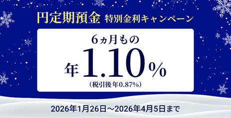 - 期間中であっても、円定期預金の預入額が一定額に達した場合にはキャンペーンを終了する場合があります。また、金融情勢の変化等により金利水準やキャンペーン期間の見直しをさせていただく場合があります。最新の金利は当社WEBサイトにてご確認ください。