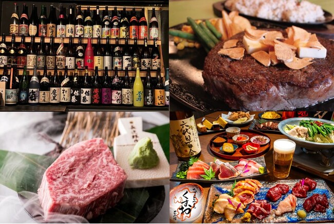 左上から右回りに、焼酎Bar 世海(津田沼エリア)、テキサス 八千代台店(八千代・勝田台エリア)、九州の旨かもん旨か酒 くすお 柏店(柏エリア)、焼肉あがり(松戸エリア)※一例