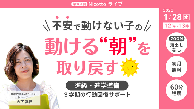 (株)パステルコミュニケーション(本社:東京都豊島区、代表取締役:吉野加容子)が運営する、発達障害・グレーゾーンの子どもを育てるママがいつでも学べて相談できるオンライン子育て塾「Nicotto!塾」は、2026年1月28日(水)お昼12時より、「不安で動けない子の動ける朝を取り戻す進級・進学準備3学期の行動回復サポート」をテーマにオンラインライブを開催いたしますhttps://desc-lab.com/nicotto202201/?prt0128