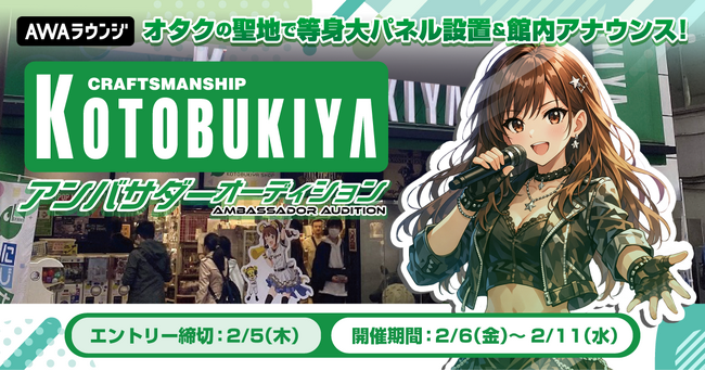 AWA株式会社(本社:東京都港区、代表取締役CEO:冨樫晃己)が運営する、サブスクリプション型(定額制)音楽ストリーミングサービス「AWA(アワ)」は、東京・秋葉原にある総合ホビーショップ『コトブキヤ秋葉原館』のアンバサダーを決定するオーディションを開催いたします。
