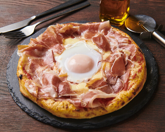 ビスマルクはトマトソースベースの生地にモッツァレラチーズと卵を乗せて焼き上げ、生ハムをトッピングしたピザです。