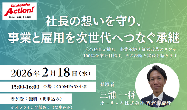 登壇者のオーリック株式会社専務取締役・三浦一将氏は、中小企業経営者を目指して北九州市職員からYMFGキャピタルのサーチャーに転じ、令和7年9月、事業承継の実現に伴い同社専務取締役に就任しました。その経験をもとに、元公務員が挑む事業承継と経営革新のリアル、100年企業を目指すその決断と実践を語ります。