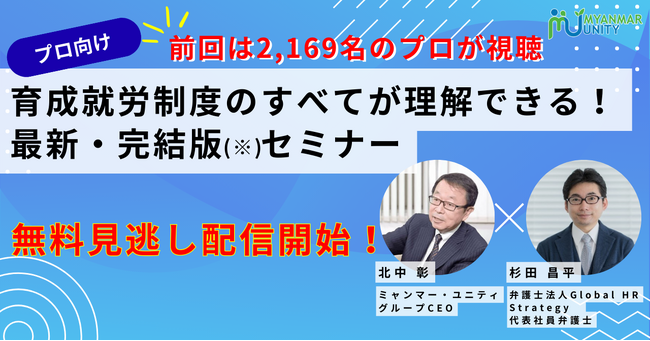 「ミャンマー・ユニティ」は、1月23日(金)に開催した「【プロ向け】育成就労制度のすべてが理解できる!最新・完結版(※)セミナー」の動画を無料公開いたします。