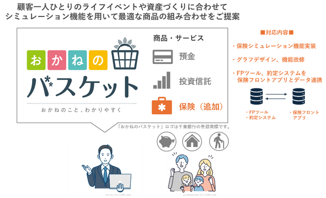 「おかねのバスケット」は、千葉銀行が提供する顧客の資産づくりのために、資産状況の把握や資産運用のシミュレーションができるサービスです。このたびインテックが提供する投資信託システムに株式会社キャピタル・アセット・プランニング(以下:CAP)の保険シミュレーションツールを保険提案機能として新たに追加し、顧客一人ひとりのライフイベントや資産づくりに合わせて投資信託と保険をワンストップで提案できる仕組みを実現しました。