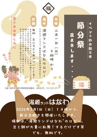 塙町地域創生事業推進協議会 主催イベント「豆まき@湯遊ランドはなわ」を開催いたします。