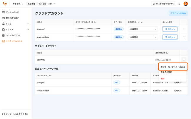 - 「クラウドアカウント」ページで、接続済みクラウドアカウント一覧の各行にある「 ⋮ 」メニューをクリックします。2. 表示される「センサーのインストール方法」を選択します。