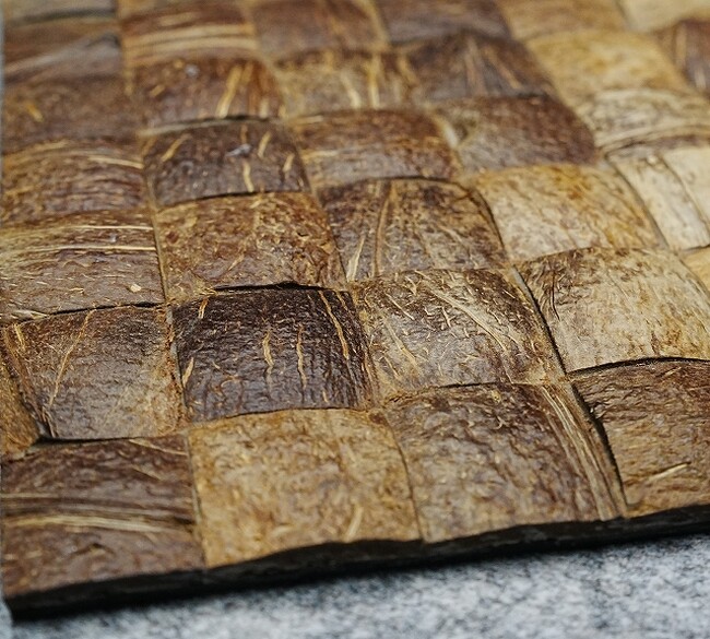 本製品は、本来廃棄されるココナッツ殻をチップ化し、内装材として再利用したアップサイクル素材から生まれた、天然素材の装飾用モザイクタイルです。家具・建具・間仕切りなどの装飾用途を想定し、天然素材を商空間で“使える意匠”として成立させることを目的に開発されました。