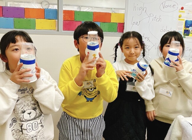 紙コップに張った膜の上のビーズが、自分の声の高さや大きさで跳ねる様子を観察。「Look! It’s dancing!」と歓声が上がり、目に見えない「音」を物理的なエネルギーとして実感しました。
