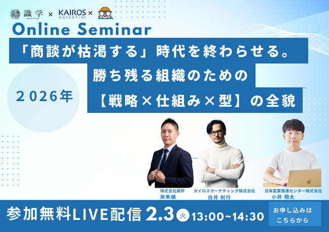 “次の一手”がデータでわかるMA+SFA一体型ツール「Kairos3(カイロススリー)」を提供するカイロスマーケティング株式会社(本社:東京都渋谷区、代表取締役:佐宗 大介、以下「当社」)は、株式会社識学、日本営業推進センター株式会社と共催で「『商談が枯渇する』時代を終わらせる。2026年、勝ち残る組織のための【戦略×仕組み×型】の全貌」を2月3日(火)に開催いたします。
