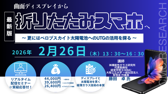 【ライブ配信/ZOOM】「曲面ディスプレイから折りたたみスマホへ~ 更にはペロブスカイト太陽電池へのUTGの活用を探る ~」セミナー開催!2月26日(木)主催:(株)シーエムシー・リサーチ