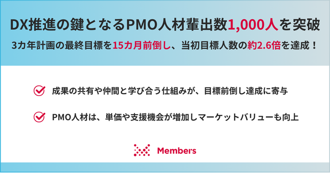 DX現場支援で顧客と共に社会変革をリードする株式会社メンバーズ(本社:東京都中央区、代表取締役社長:高野 明彦、東証プライム:2130、以下「メンバーズ」)は、2024年5月より開始した企業におけるDX推進の鍵となるプロジェクトマネージャーをサポートするPMO(プロジェクト・マネジメント・オフィス)人材の輩出数が、2025年12月時点で累計1,000人を突破したことをお知らせします(※1)。当初想定よりもさまざまな領域のデジタル人材がPMO育成カリキュラムを受講した結果、2024年5月に掲げた中期事業戦略における、2027年3月末までに385人輩出という最終目標を15カ月前倒しで達成し、輩出人数は当初目標の約2.6倍に到達しました。