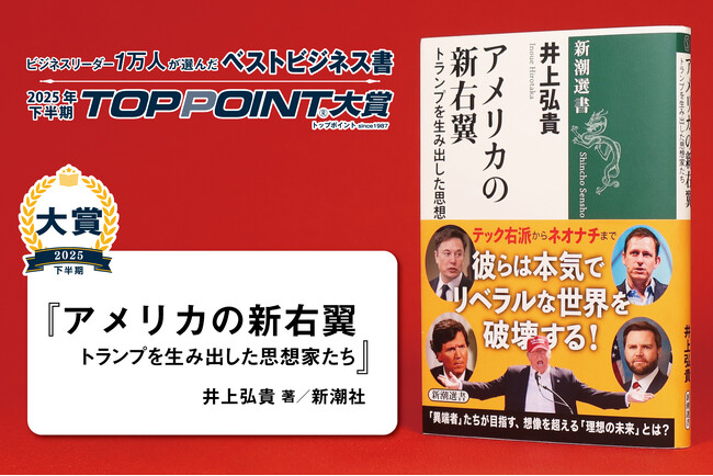 「一読の価値ある新刊書」を厳選して紹介する月刊誌『TOPPOINT(トップポイント)』。1987年創刊の同誌が、ビジネスリーダーを中心とする1万名以上の定期購読者へのアンケートで決定する「TOPPOINT大賞(2025年下半期)」に、井上弘貴・神戸大学教授の著書『アメリカの新右翼:トランプを生み出した思想家たち』(新潮選書)が選ばれました。ビジネス書でも経済書でもない、アメリカの政治思想を扱った本が「TOPPOINT大賞」に選ばれるのは異例のことで、ビジネスリーダーたちにとってもトランプ政権の動向は死活的な関心事になっているようです。