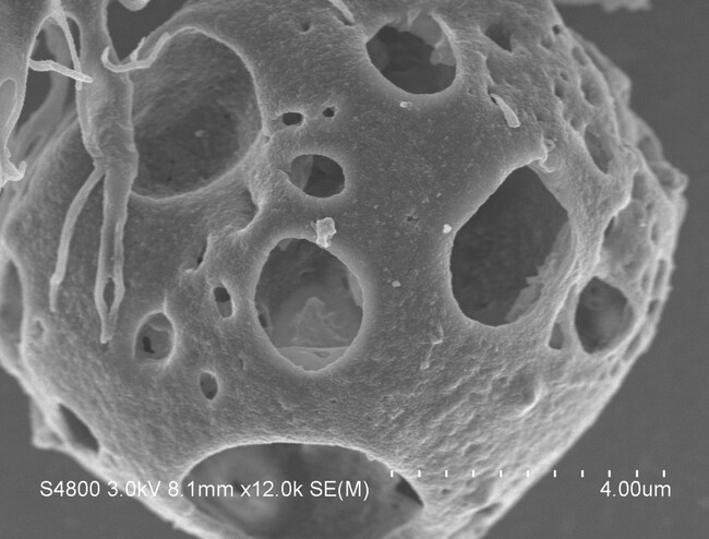 図:NK/Tリンパ腫細胞にANAP抗体の添加後30分で大きな穴があいた電験像
