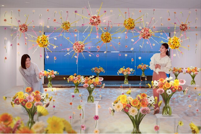 リゾナーレ熱海が位置する熱海市では、年間を通して花火大会が10回以上開催され、花火は街のシンボルといえる存在です。花火の多種多様な形や色合いを、ガーベラを用いて表現しました。静岡県はガーベラ栽培が盛んで、作付面積・出荷量・産出額いずれも全国1位を誇り、出荷量に関しては国内の約40%を占めます(*1)。一重咲きやスパイダー咲きなど、花弁のスタイルによる複数の咲き方と、バラエティに富んだ花の色を持つガーベラは、花火と重なり合う特徴があります。花火をガーベラで表現した空間で、リゾナーレ熱海ならではの春を楽しんでほしいという想いから、本イベントを企画しました。