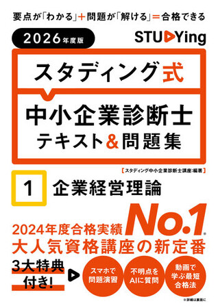 オンライン資格取得講座「STUDYing(スタディング)」を提供するKIYOラーニング株式会社(本社:東京都千代田区、代表取締役社長:綾部貴淑)は、新ブランド「スタディング出版」の第1弾書籍として、『2026年度版 スタディング式 中小企業診断士 テキスト&問題集』(全7科目)を2026年1月より順次刊行いたします 。合格者数No.1※の知見を凝縮し、書籍・スマホ問題集・AI学習支援を一体化した「一冊で完結する新しい独学スタイル」を提案。1月より3月にかけて1次試験全7科目をラインナップし、独学者の短期合格を支援します 。