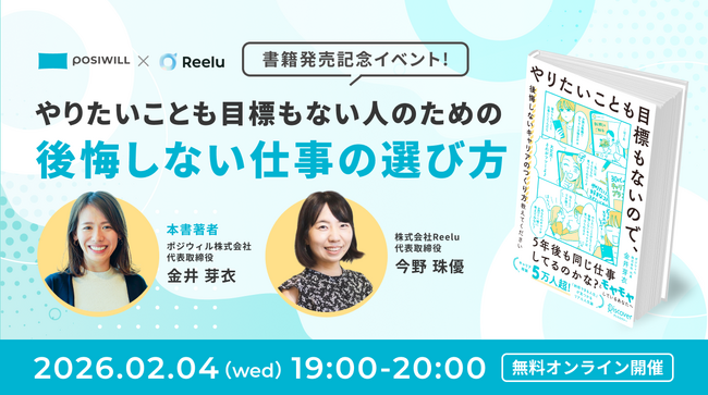 株式会社Reelu(本社:東京都港区、代表取締役:今野珠優、以下Reelu)は、ポジウィル株式会社(本社:東京都千代田区、代表取締役:金井芽衣、以下ポジウィル)代表・金井芽衣氏の新刊『やりたいことも目標もないので、後悔しないキャリアのつくり方教えてください』(ディスカヴァー・トゥエンティワン、2026年1月23日発売)刊行を記念し、特別オンライン対談イベントを2026年2月4日(水)19:00よりオンライン開催します。
