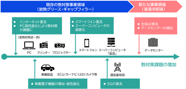 当社は長年にわたり、放熱グリース※2 や放熱ギャップフィラー※3 などの放熱材を軸に、電子機器や自動車分野など様々な業界の熱対策課題に取り組んでまいりました。今後もこれまで培ってきた技術と知見を最大限活用し、熱対策事業の強化を図り、総合的な熱対策ソリューションの提供を目指してまいります。