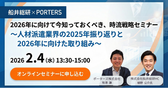 人材ビジネス向けマッチングシステムを提供するポーターズ株式会社(東京証券取引所グロース.証券コード5126、東京都港区、代表 西森 康二)は、株式会社船井総合研究所と共同で「2026年に向けて今知っておくべき、時流戦略セミナー~人材派遣業界の2025年振り返りと2026年に向けた取り組み~」と題した無料セミナーを2026年2月4日(水)13:30~オンラインで開催いたします。