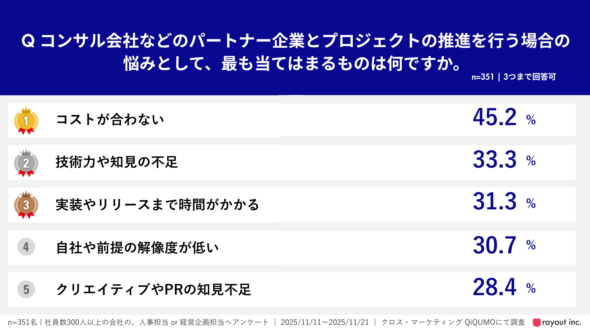 先述した調査でも、コンサル会社などのパートナー企業とプロジェクトの推進を行う場合の悩みとして、「コストが合わない」(45.2%)や「実施やリリースまで時間がかかる」(31.3%)が上位に挙がり、コストを抑えてしっかり推進してくれるパートナーの存在が求められていることが明らかになっています。